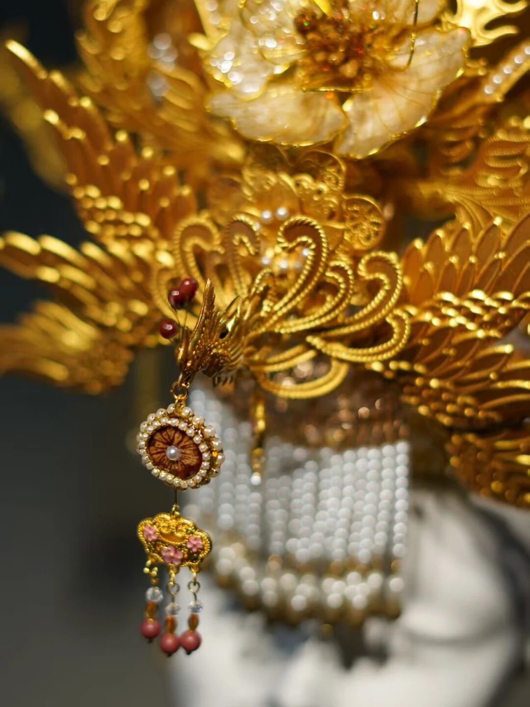 “中藥之冠”由揚子江聯(lián)合文化創(chuàng)作博主共同打造,設(shè)計靈感源自傳統(tǒng)龍鳳冠,既承載了“龍鳳呈祥”“健康長壽”的美好寓意,又實現(xiàn)了對中藥材的藝術(shù)化再造。制作團隊從上百種藥材中精選20余味,用特殊工藝保留藥材天然質(zhì)感與清雅藥香:木蝴蝶被塑造成層疊的牡丹花瓣,金銀花與紅豆搭配成精巧花蕊,冠冕流蘇則由多味藥材研磨制成的香珠串聯(lián)而成,成為可觀賞、可感知的中醫(yī)藥文化新載體。